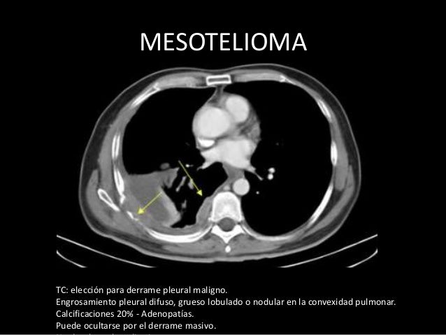 Mesotelioma maligno medlineplus enciclopedia médica. More mesotelioma maligno pleural images. Derrame pleural bilateral en pacientes sin insuficiencia. Abstract. Background pleural effusion is a frequent disease in the clinic, to which should face not only the internist and the neumologist, but other specialists including general practitioners. Objective to define this type of disease and its different causes.Method fifty cases of bilateral pleural effusion in patients without heart failure diagnosis were presented, studied from 1996 to. Derrame pleural instituto oncoguia. O derrame pleural maligno é uma condição grave e potencialmente fatal que deve ser investigada e tratada de forma eficaz evitando piora do quadro do paciente. Mesotelioma pleural. Causas, diagnóstico y tratamiento.. Cirugía se utilizan 3 tipos de cirugía en el tratamiento del mesotelioma la cirugía diagnóstica. Para obtener una muestra para la biopsia. Se lleva a cabo por toracoscopia o por cirugía pleural abierta. La cirugía paliativa, que incluye la pleurodesis, toracoscopia con pleurodesis y, más raras veces, shunt pleuroperitoneal. Tumor fibroso solitario. Estudio clínicopatológico de 16. Volumen 79, no. 5, septiembreoctubre 2011 419 tumor fibroso solitario discusión el tumor fibroso solitario fue detallado en 1931 por klemperer y rabin1 como una lesión localizada y benigna; una década después, en 1942, stout y murray,5 en estudios ba sados en cultivo de tejidos, sugirieron un origen mesotelial. Mesotelioma wikipedia, la enciclopedia libre. Mesotelioma (o mesotelioma maligno) es una forma rara de cáncer que se desarrolla a partir de células transformadas originarias del mesotelio, el revestimiento protector que cubre muchos de los órganos internos del cuerpo.El mesotelioma pleural es una placa dura, blanquecina grisacea. Generalmente es causada por la exposición al amianto. [1] la pleura (el revestimiento exterior de los.